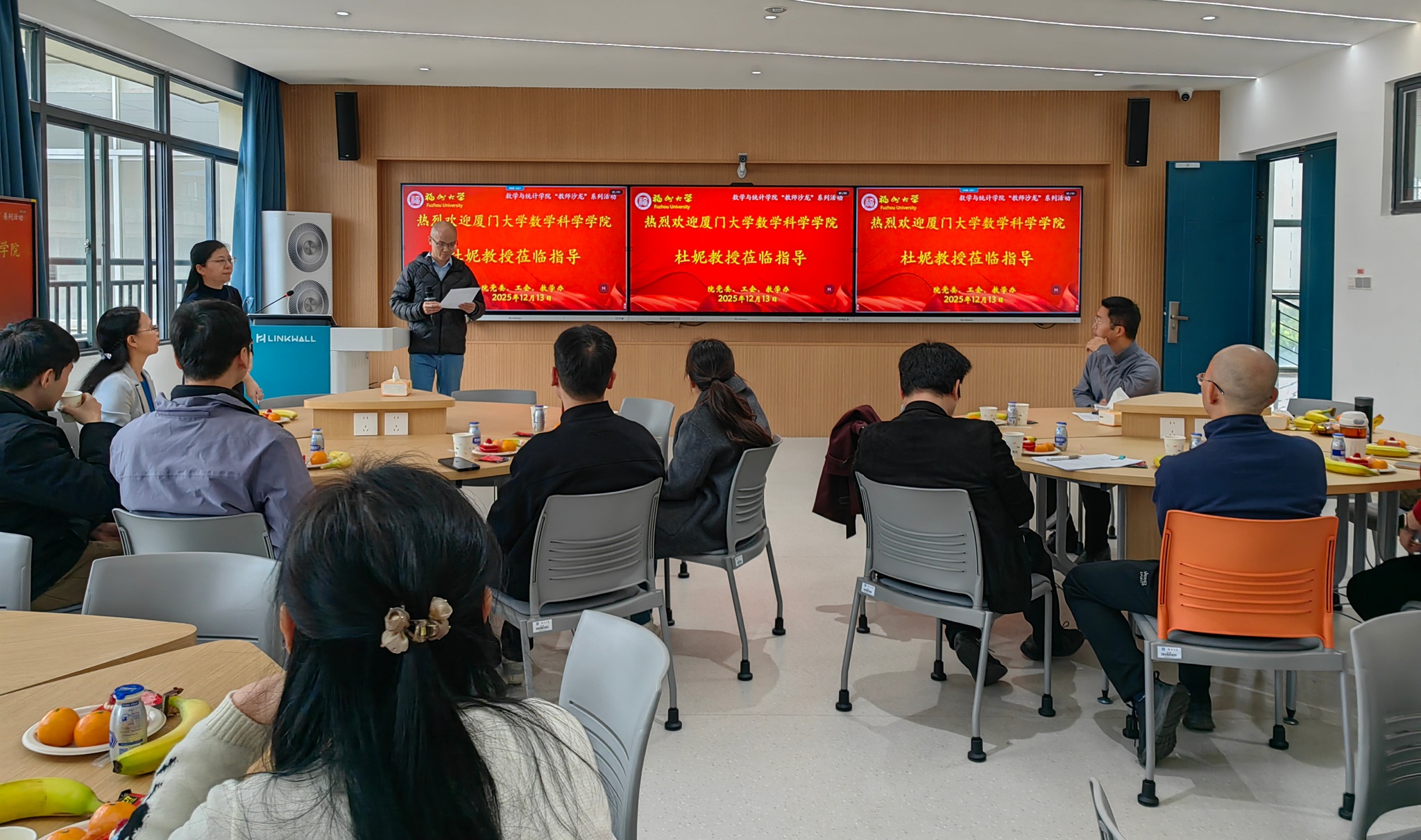 12月13日上午,数统学院在院504智慧教室举办第五期教师沙龙活动。本期主题围绕数智课程建设,特邀嘉宾厦门大学数学科学学院杜妮教授,以“数智化视域下的课程建设及教学创新”为题做专题报告。学院党委书记郑世珠、副院长程航教授、院工会主席吕书龙教授以及部分教师20多人参加。沙龙活动由副院长程航教授主持。